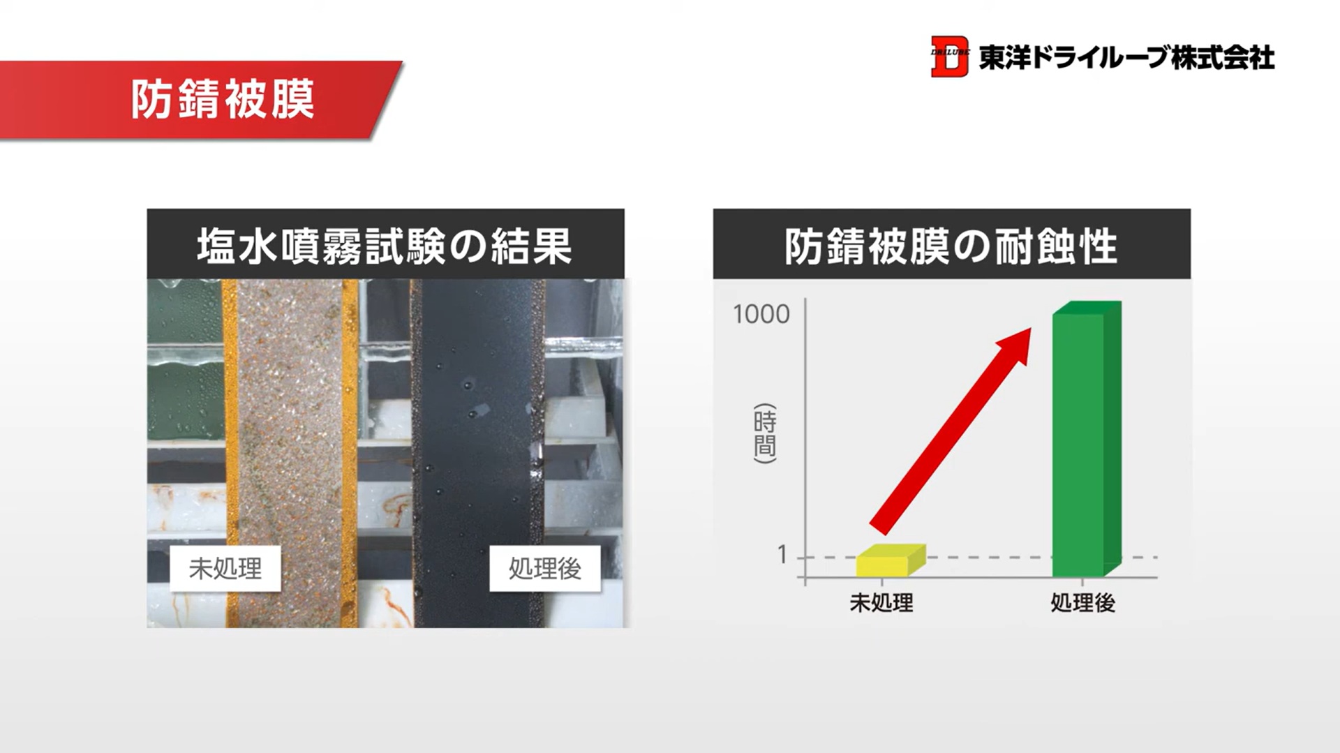 実際に未処理品と防錆被膜を施した素材で塩水噴霧試験を行ったところ、未処理品は錆の影響で、わずか8時間で試験が終了してしまいましたが、防錆被膜を施した素材は1000時間経過しても錆は発生せず、防ぐことができています。防錆被膜は、金属表面をコーティングすることで水分や酸素を金属に触れさせず、反応させないことを重視しています。