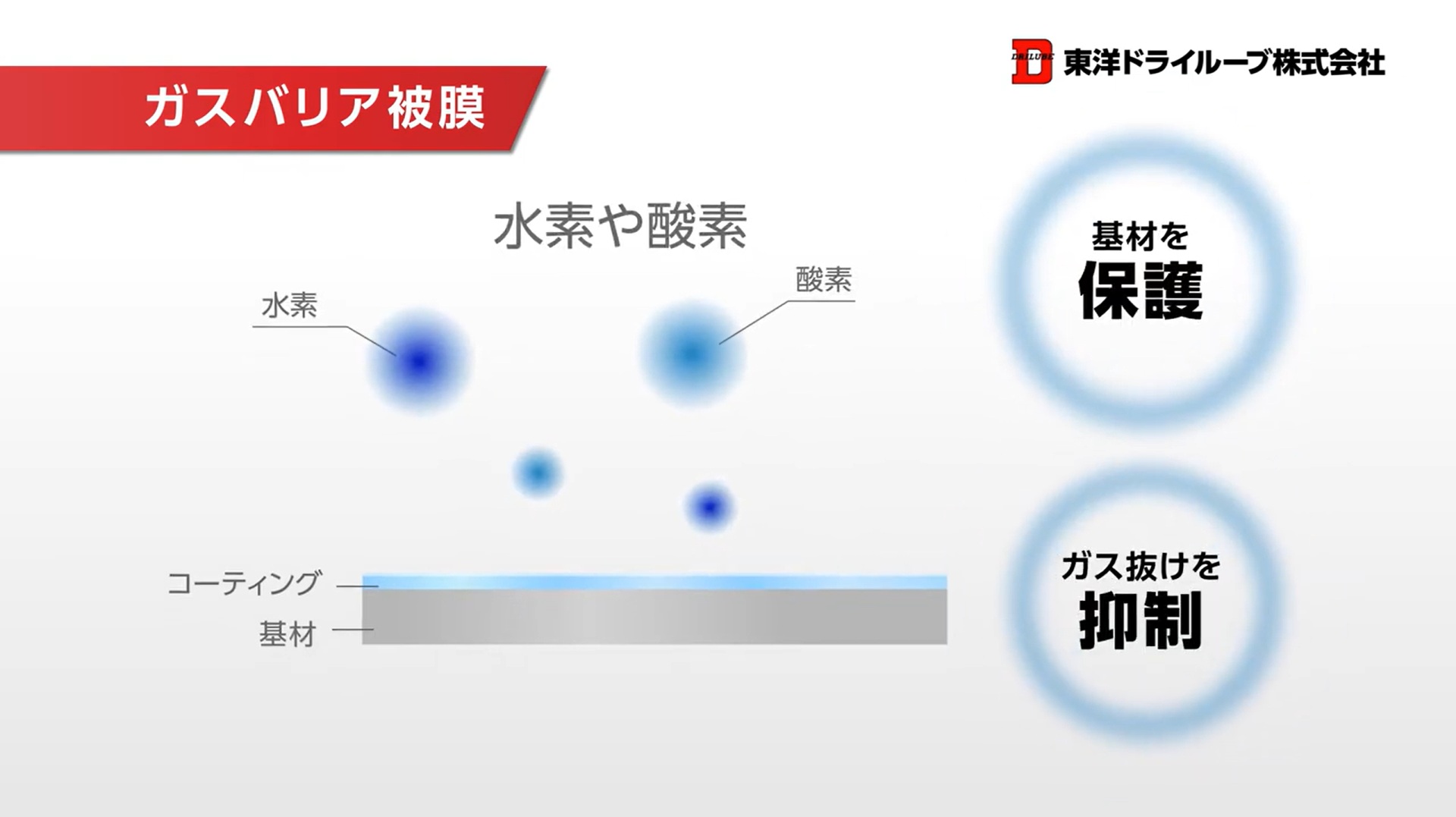 東洋ドライルーブ株式会社が開発した「ドライルーブ」は、潤滑物質と各種特殊バインダーをハイブリッドに配合し、各種溶剤や水に分散させた耐薬品・防ガス被膜です。今回紹介した被膜の種類にも対応しており、耐薬品や防錆、ガスバリアなどさまざまな効果をもたらします。あらゆる製品・部品に高い付加価値を与えられるドライルーブをぜひご活用ください。