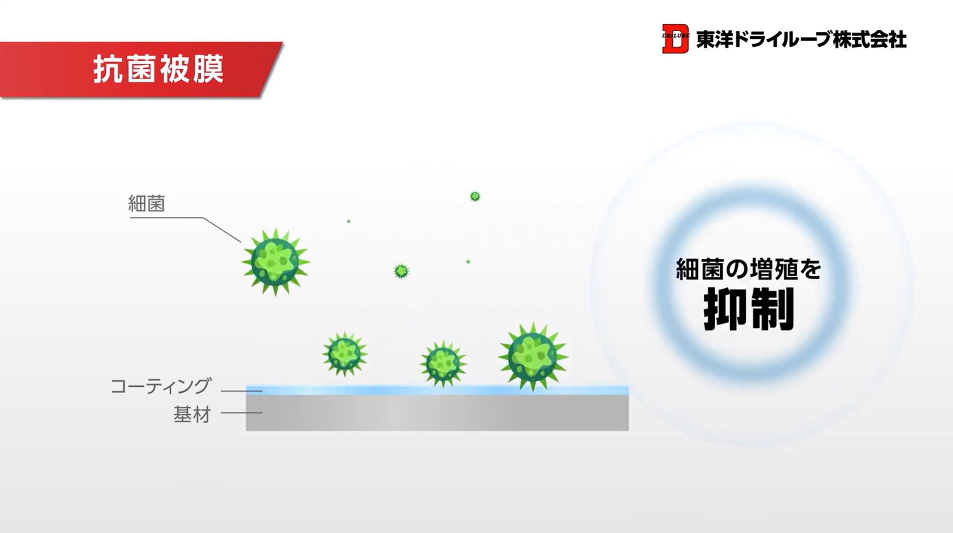 抗菌被膜とは、ウイルスや細菌、カビなどが基材の表面で繁殖するのを防ぐための被膜です。抗菌は菌の成長・増殖を抑制するものであり、除菌や殺菌のように菌や微生物を減少させるものではありません。しかし、そもそも菌が多くいる状態を防げるようになっているため、衛生性を必要とする場面や器具などに多く用いられています。